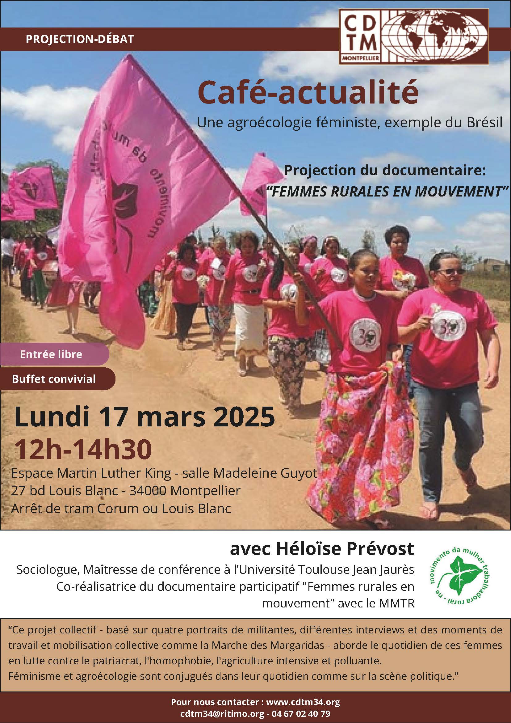 Projection suivie d'un débat avec Héloïse Prévost, Sociologue, Maîtresse de conférences à l'Université Toulouse Jean Jaurès et co-réalisatrice du documentaire participatif "Femmes rurales en mouvement" avec le Movimento da mulher trabalhadora rural (MMTR).