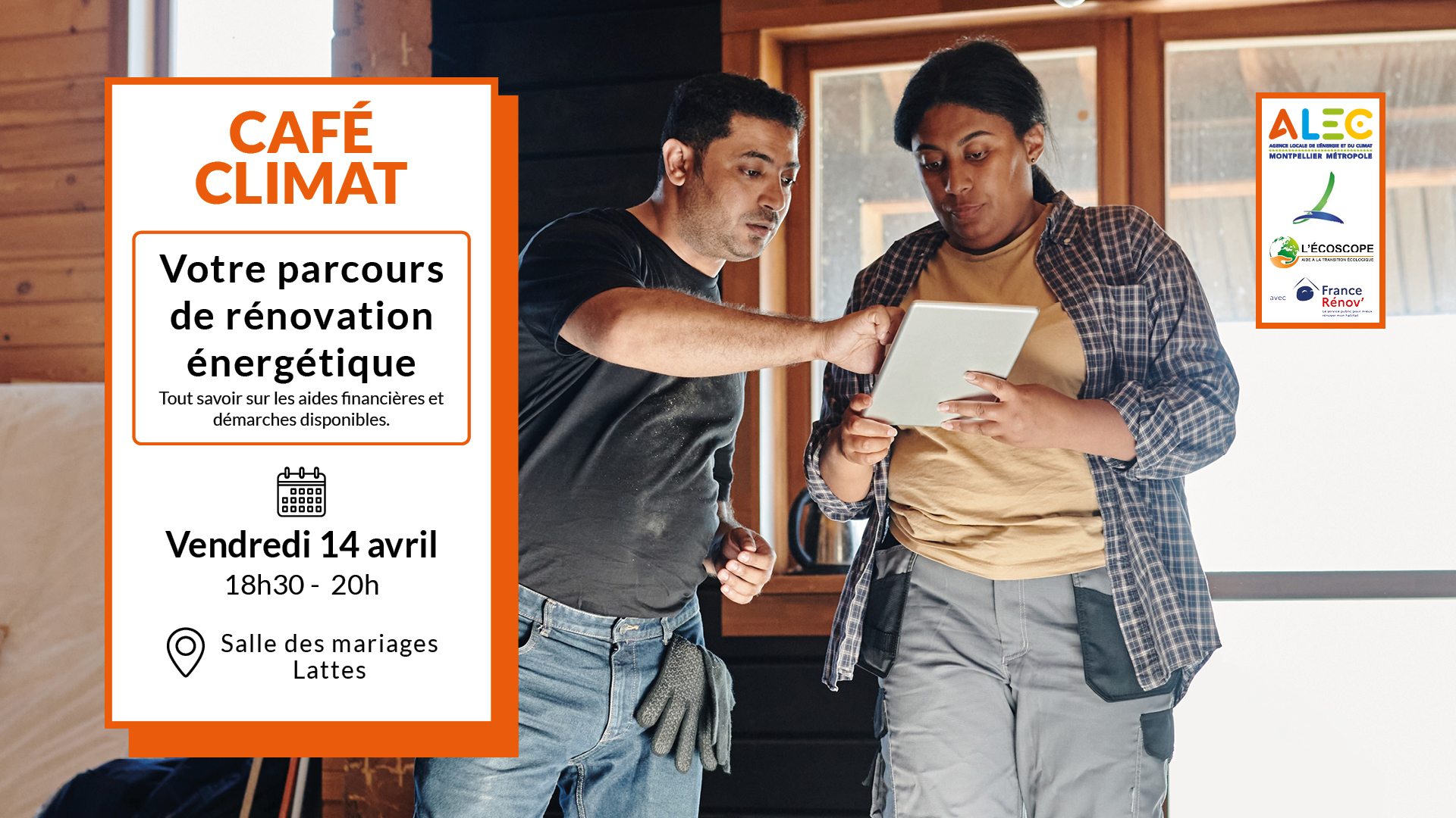 Vendredi 14 avril 2023 de 18h30 à 20h, l’ALEC Montpellier Métropole et la commune de Lattes, en association avec l’Écoscope, vous invitent au Café Climat à la salle des mariages afin d’aborder ensemble les parcours de rénovation énergétique. À destination des particuliers, cet échange vous en apprendra plus sur les aides disponibles pour la rénovation dans le but de soutenir la transition énergétique.