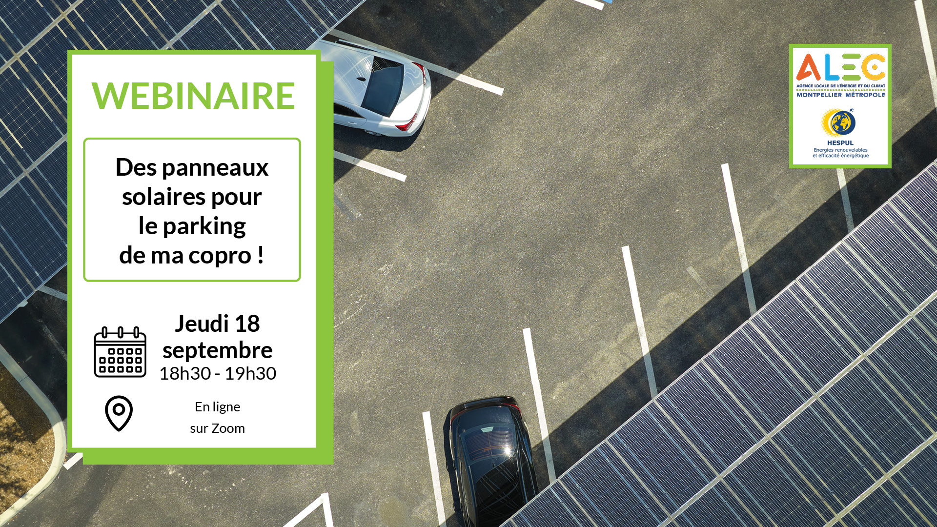 Jeudi 18 septembre 2025 à 18h30, l’ALEC Montpellier Métropole vous donne rendez-vous pour un webinaire concernant l’installation de panneaux solaires sur les parkings de copropriété, avec un focus sur la loi APER et les nouvelles obligations des copropriétés sur ce sujet.