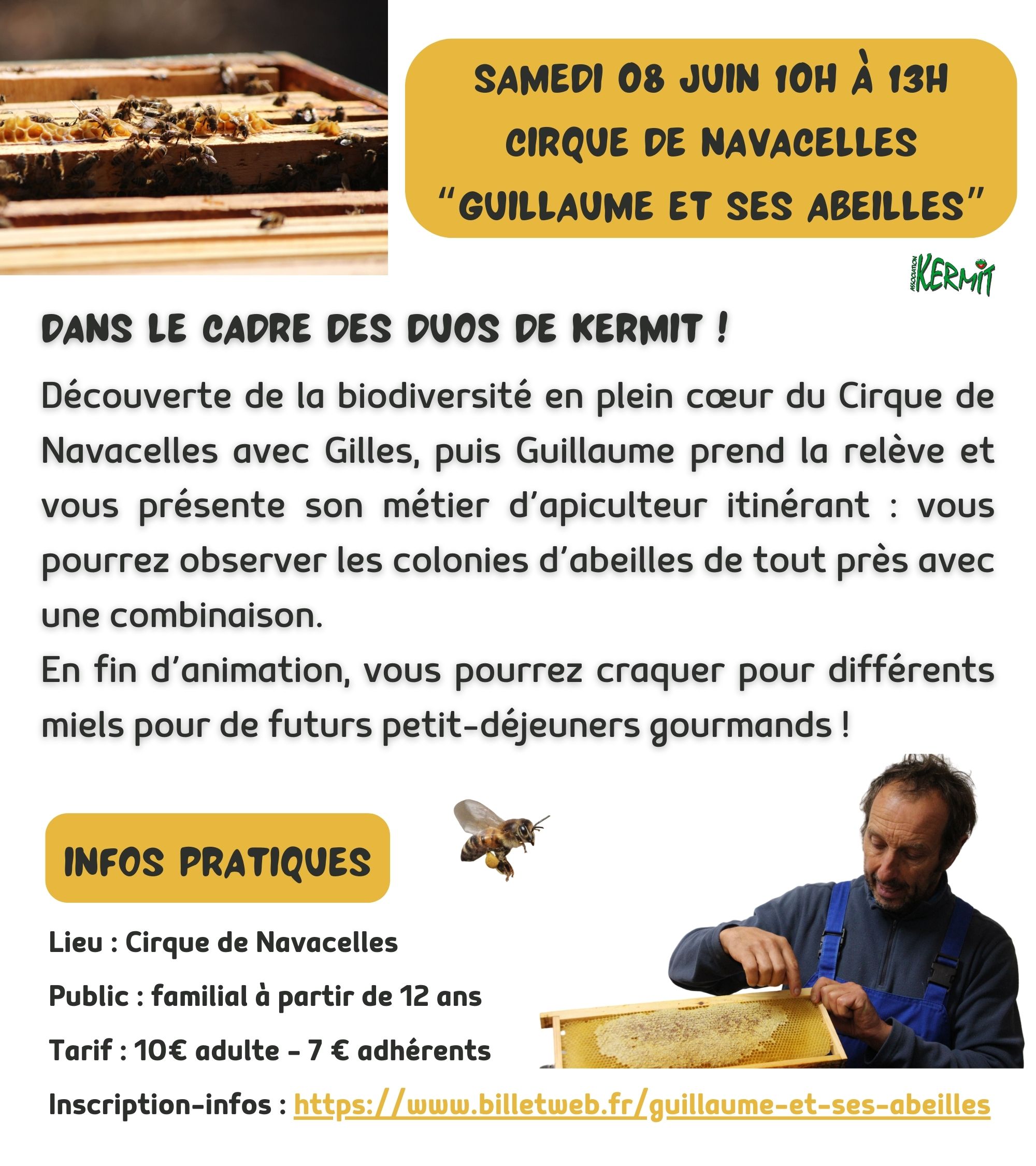 Découverte de la biodiversité en plein cœur du Cirque de Navacelles avec Gilles, puis Guillaume prend la relève et vous présente son métier d’apiculteur itinérant : vous pourrez observer les colonies d’abeilles de tout près avec une combinaison.