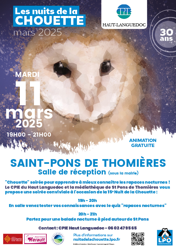 Le CPIE du Haut Languedoc et la médiathèque de St Pons de Thomières vous propose une soirée conviviale à l'occasion de la 15e Nuit de la Chouette :