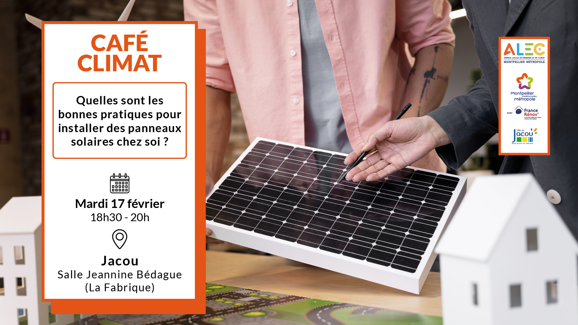 L’ALEC Montpellier Métropole et la Ville de Jacou, vous donnent rendez-vous mardi 17 février 2026 pour un Café Climat dédié aux bonnes pratiques pour installer des panneaux solaires chez soi.