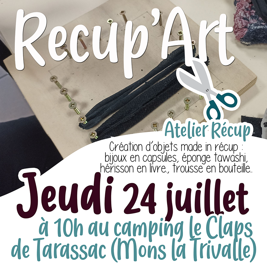 ATELIER RECUP'ART : Que faire de tous nos déchets ? Et si on leur donnait une seconde vie !  Créons des objets made in Récup : bracelets en capsules, porte-monnaie en brique alimentaire, bougeoir en canette ou encore hérisson en livre… laissez libre cours à votre créativité !