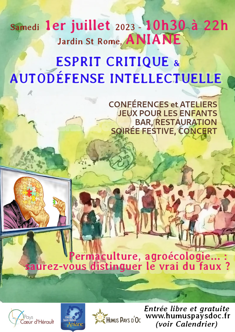 Agriculture bio, durable, permaculture, agroécologie, biodynamie, agriculture de conservation... Autant de termes qui colportent rumeurs, fausses nouvelles, idées reçues… A l'occasion de cette dernière rencontre de la transition organisée par Humus Pays d'Oc avec le soutien du Pays Coeur d'Hérault, nous vous proposons un sujet de choix pour affûter votre esprit critique ! Au programme : conférences, ateliers pour petits et grands pour découvrir les principaux biais cognitifs auxquels nous sommes confrontés et les contourner, village associatif.