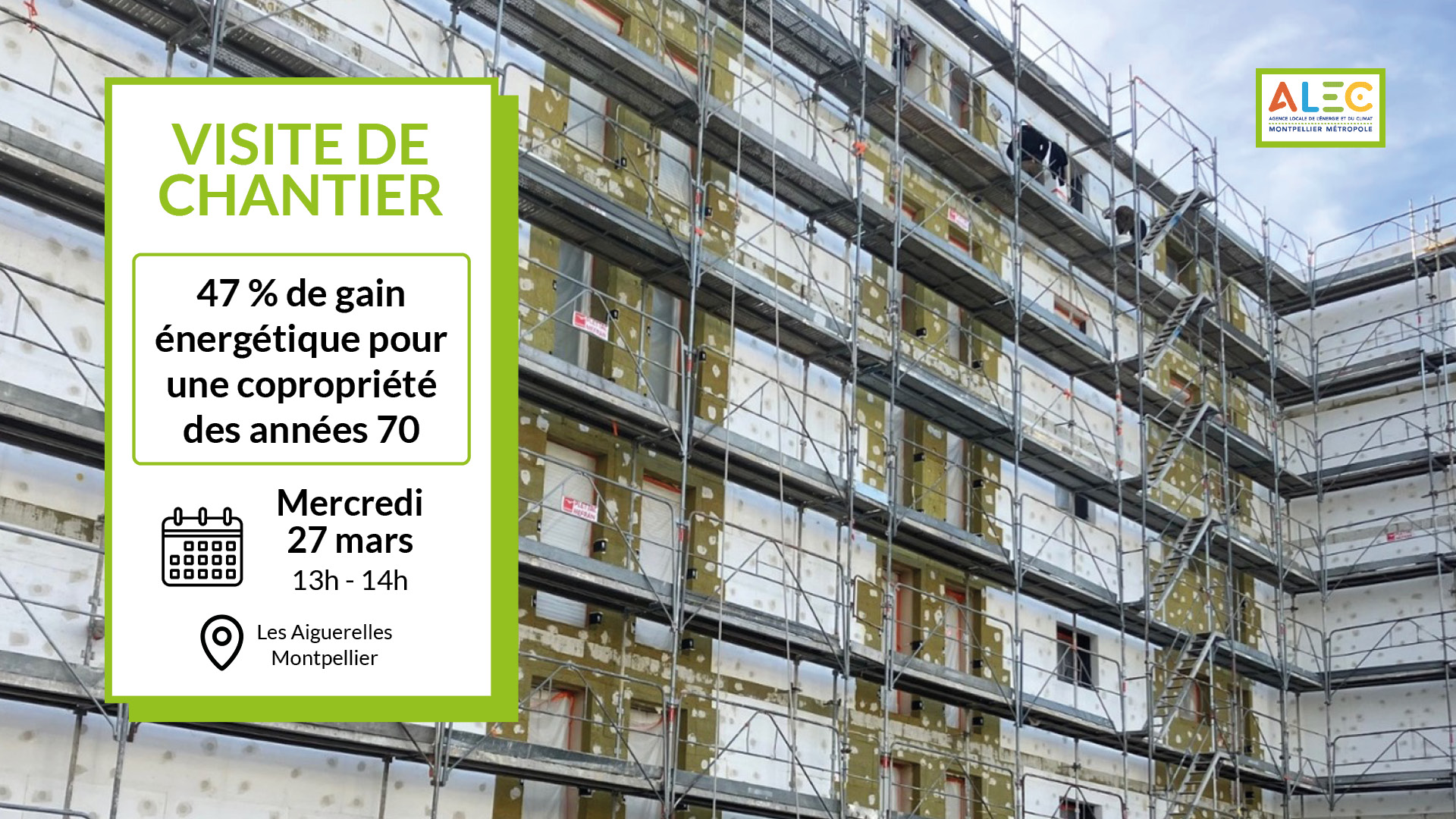 Mercredi 27 mars 2024 à 13h, l’ALEC Montpellier Métropole vous donne rendez-vous pour la visite du chantier d’une copropriété en cours de rénovation. Si votre copropriété envisage des travaux de rénovation énergétique, c’est l’occasion d’observer le chantier et de mieux vous projeter !