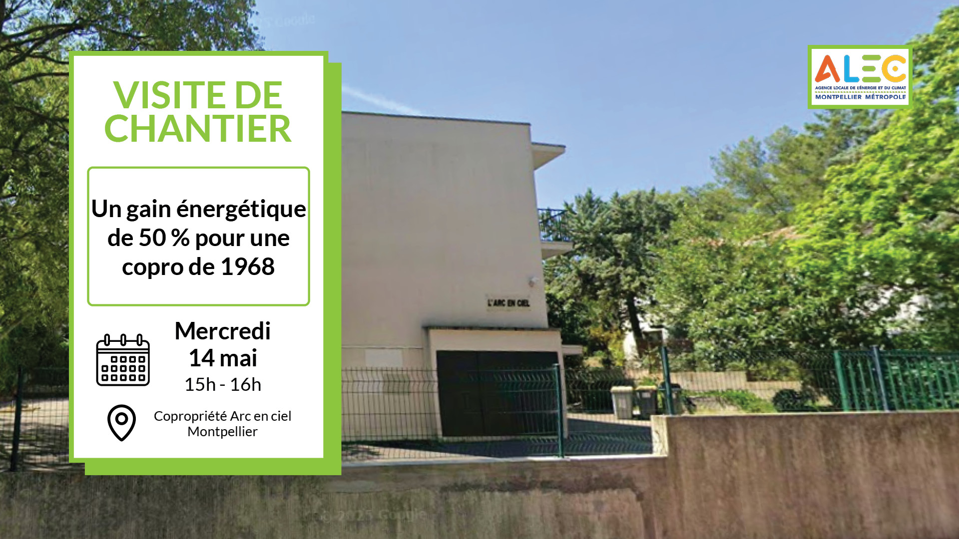 Mercredi 14 mai à 15h, l’ALEC Montpellier Métropole vous donne rendez-vous pour la visite du chantier d’une copropriété en cours de rénovation : la copropriété Arc en ciel.