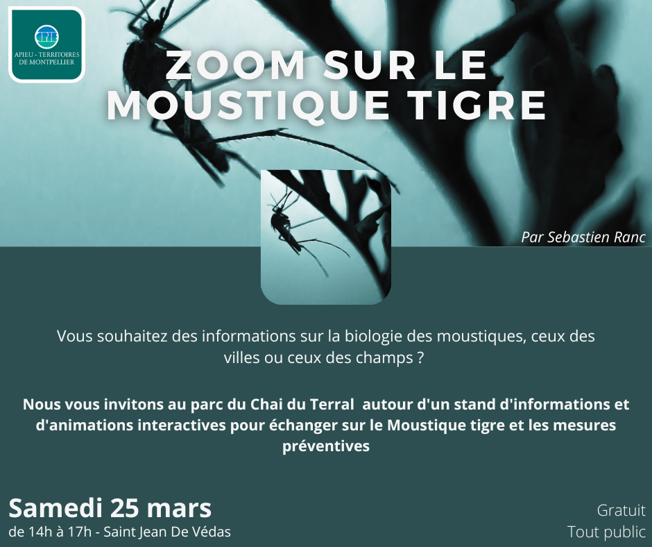 Nous vous invitons au parc du Chai du Terral (Saint-Jean-De-Védas) de 14h à 17h autour d'un stand d'informations et d'animations interactives pour échanger sur le Moustique tigre et les mesures préventives.